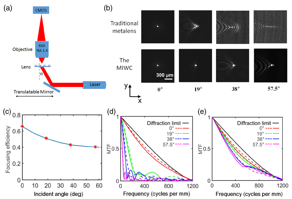 图三 超构透镜阵列不同角度下成像性能表征。(a) 聚焦性能测试光路图;(b) 传统超构透镜对不同入射角度光焦距光斑(上行)对比超构广角相机结果(下行);(c) 超构透镜阵列不同角度的聚焦效率;(d) 传统超构透镜MTFs(调制传递函数)与 (e) 角度设计的超构透镜阵列的MTFs的对比。