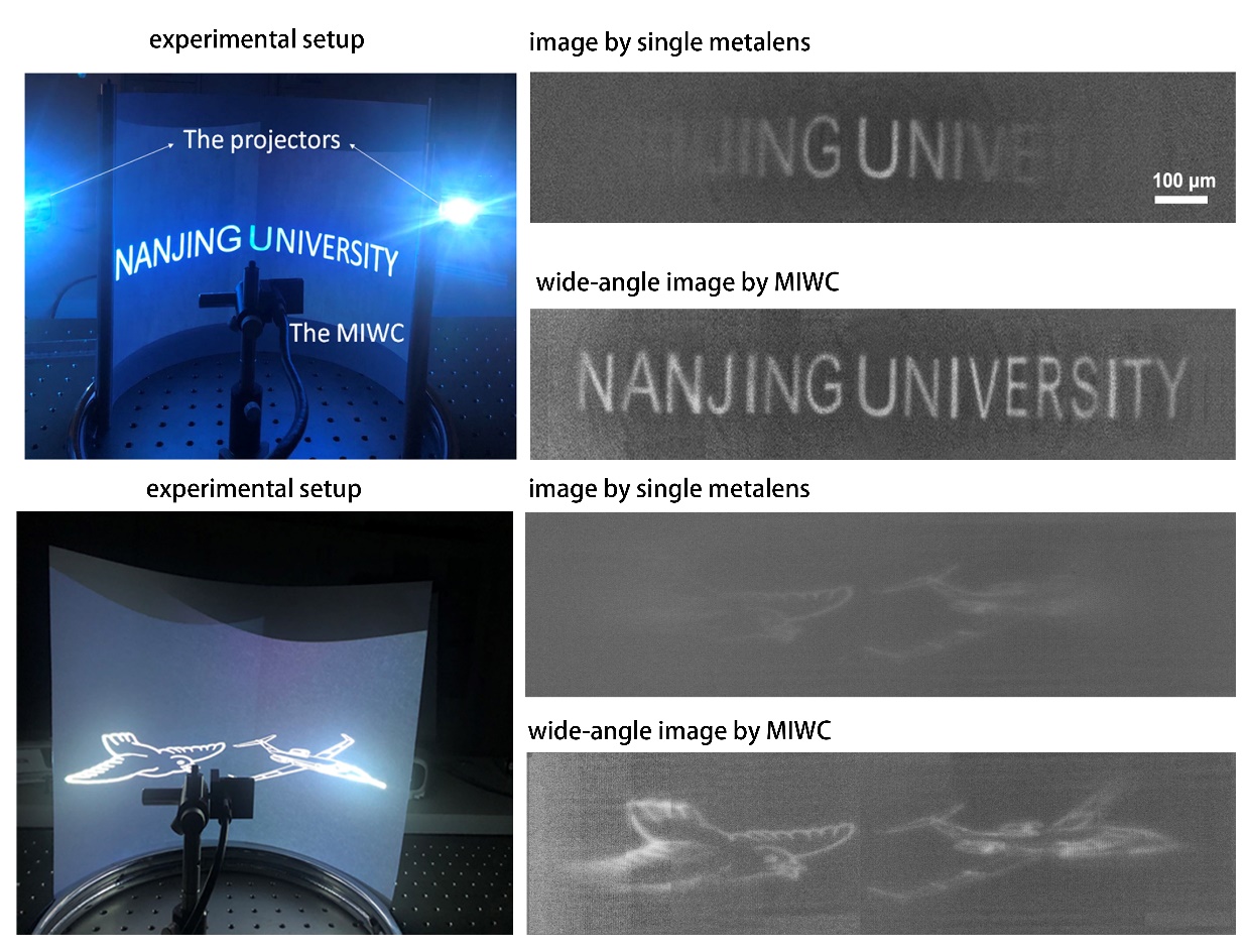 图五 广角成像对比。(左侧)成像装置示意图;(右上)单个超构透镜成像结果,对比(右下)超构透镜广角相机成像结果。