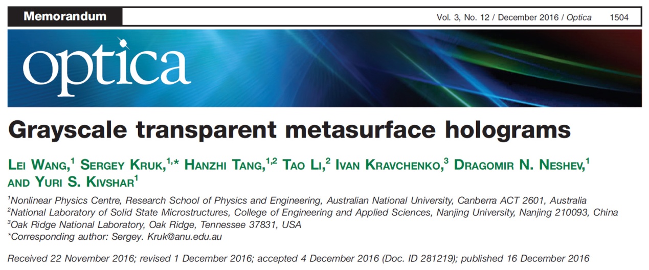 经公司学工组和量子电子学与光学工程系的推动,光电信息工程专业的13级本科生汤涵智,通过自主报名、面试选拨,于2016年4月获得国家留学基金委资助的赴澳大利亚国立大学(ANU)交流学习项目。在项目开展之前,汤涵智同学在光学系老师的帮助下,积极联系ANU的相关教授,通过邮件和视频研讨拟开展的交流项目和科研训练课题,提前做了充分的研究调研。汤涵智于8月20日至11月20日赴ANU进行了交流学习。得益于之前的认真准备,他去之后就迅速进入他们最前沿的课题研究-高效率超表面全息成像。此时,相关研究已经进入到光学表征和性能测试阶段。汤涵智参与了实验测试部分,掌握了微纳光学表征与测试手段,获得了非常理想的数据。经对方指导教授审核,成果意义重大。他们迅速组织团队撰写论文并投稿,在半个月左右时间就被光学界一流刊物的Optica接受发表在“Memorandum”栏目(Optica 3, 1504 (2016),见图一)。汤涵智参与其中光学测试的部分,排在第三作者(其中第二作者为具体指导该研究的通信作者)。