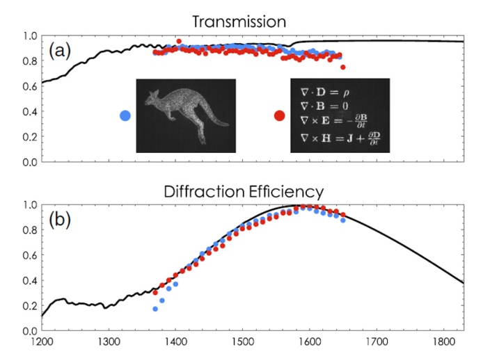 图二、超表面全息示意图和实验获得的高透射率与衍射效率数据结果。