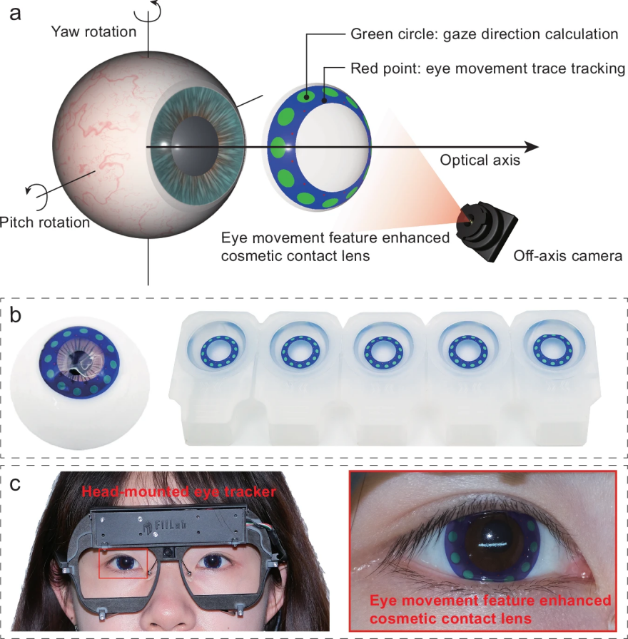 近日,南大徐飞教授联合江苏省人民医院袁松涛主任提出了一种眼动特征增强美瞳(EMFE contact lens)。该美瞳基于空间-色度编码原理,在具备舒适性、美观性、安全性的同时提高了在日常自然环境下眼动追踪的鲁棒性与精度,技术成熟度高,可以直接真人佩戴使用。