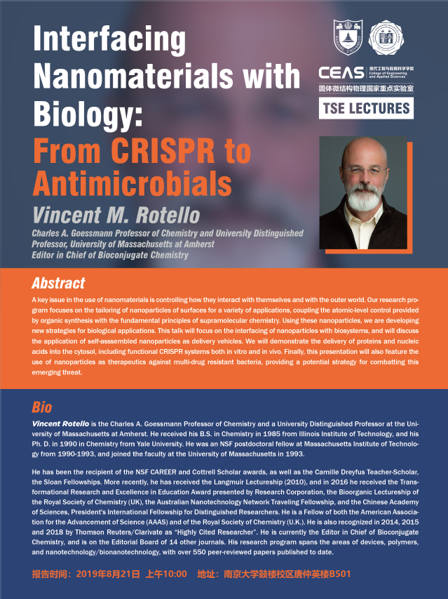 我们有幸邀请到美国University of Massachusetts Professor Vincent M. Rotello,作为TSE Lectures系列讲座的第八讲嘉宾。报告信息见下,欢迎各位老师和同学参加!