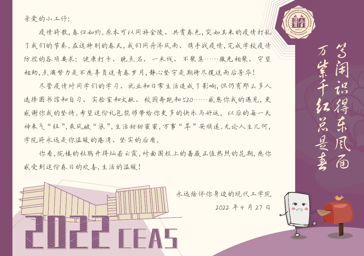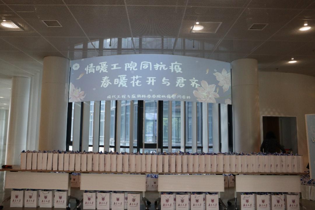为鼓励公司全体同学在疫情期间凝心聚力、共克时艰,用积极阳光的心态面对困难、迎接挑战,4月27日,现代工程与应用科学公司党委开展“情暖工院同抗疫·春暖花开与君齐”抗疫慰问活动。公司党委书记臧文成老师,副经理张弢老师、李涛老师、卢明辉老师,办公室主任、学工办副组长尉芹溪老师,团委副书记、研究生辅导员李敏老师,团委副书记、本科生辅导员李烨婧老师,还有花雨老师、袁玲老师出席活动并向同学们发放“抗疫大礼包”,为同学们送去公司的温暖。