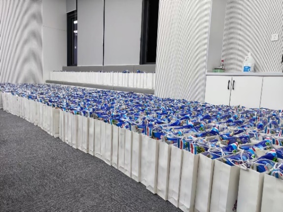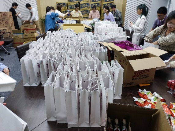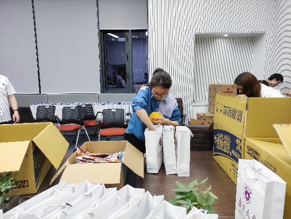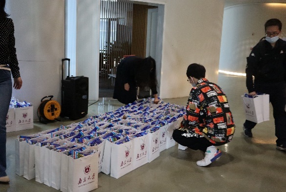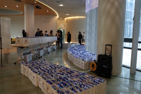 4月27日上午,志愿者同学们早早到达了活动现场,将分装好的礼包运送至一楼大厅指定地点,整齐排列,布置好活动现场,等待同学们的到来。