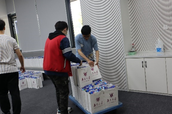 4月26日晚,院楼C101会议室灯火通明,二十余名志愿者同学在李敏老师的指导下,以“流水线”的方式高效、协同地完成了1000余份“抗疫大礼包”的分装。搬物资、整理袋子、装袋,整个流程井然有序。每一份沉甸甸的礼包都寓意深刻,其中包括苹果、旺仔牛奶、曲奇饼干、棒棒糖、薯卷、公司定制口罩和一份情意满满的慰问信。公司希望这份礼包可以带给同学们更多的快乐和好运,以后的每一天都“神来气‘旺’,乘风破‘浪’,生活甜甜蜜蜜,万事‘苹’安顺遂。”