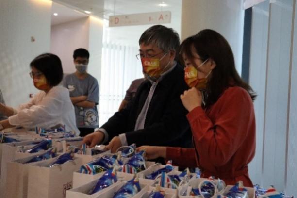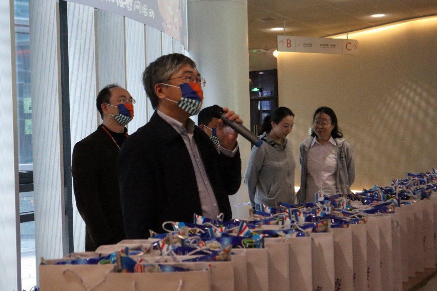 9时30分,活动正式开始。同学们热情似火,早已在大厅排队等待。在分发礼包之前,臧文成书记表示,猝不及防的疫情对大家的学习生活都造成了一定的影响,希望同学们做好防护,共克时艰,健康向上,对未来充满期待,展现昂扬向上的精神风貌。臧书记还为大家讲解公司定制的口罩,图案是去年院楼启动仪式前定制的,方格象征着我们公司大楼,蓝色代表天空,橙色代表朝阳,这也就是我们公司标准的现代蓝和工院橙,“CEAS”是太阳成集团122ccvip的英文缩写。我们的公司文化正在形成之中,而每个人都是公司文化的建设者,希望大家可以保持乐观向上的心态,共同为公司的建设添砖加瓦。