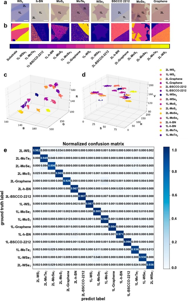 二维材料是一类仅有原子级厚度的新型薄膜材料。目前二维材料成员已多达几百种,并且各种二维材料会组合在一起,形成异质结或超晶格来构筑功能器件。然而,各种二维材料的外观颜色极其相似,难以快速辨别。过去人们通常需要使用原子力显微镜,X射线衍射,扫描电镜,透射电镜等多种昂贵的设备和繁琐的流程来识别与表征。因此,一种快速、无损、高准确率的识别/表征技术对二维材料及器件应用至关重要。