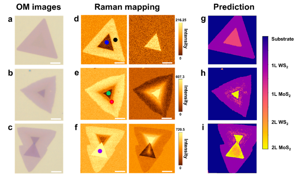 图3 MoS2/WS2异质结的拉曼光谱和人工神经网络表征。(a)-(c)异质结的OM图片;(d)-(f)异质结的拉曼平面扫描图;(g)-(i)识别结果。标尺10微米