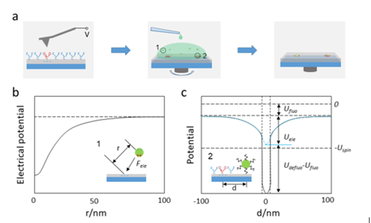 图1 a)组装过程示意图;b)非极性溶剂中电场力与电势中心空间距离的关系,百纳米的电场力作用范围可保证纳米颗粒被高效地富集到电势位置;c)介电质表面能与电势位置关系图,电势中心去氟化提供的高表面能保证纳米颗粒的短程固定。