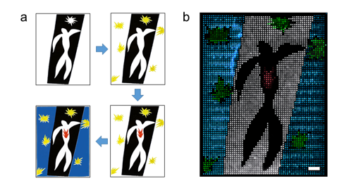 通过重复“电势书写-颗粒组装”的循环,该方法可获得不同纳米颗粒的多层组合图案。我们使用了四种纳米颗粒,模仿打印了法国画家亨利·马蒂斯的著名画作《The Fall of Icarus》(图3)。白色、红色、绿色和蓝色分别用15 nm Fe2O3和对应发光颜色的CdSe@ZnS纳米颗粒来表现,多层组装过程无交叉污染,首次实现了真正的彩色纳米打印。