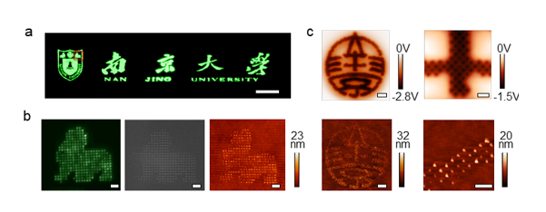 图2 a)CsPbBr3纳米颗粒大范围组装荧光图,比例尺:50μm;b)局部放大的荧光、SEM和AFM形貌图,比例尺:2 μm;c)200 nm间隔图案KPFM电势图和组装后AFM形貌图,比例尺:500 nm。