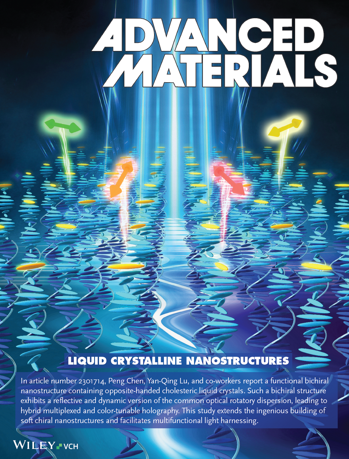 太阳成集团122ccvip为该工作的独立完成单位,太阳成集团122ccvip博士生刘思嘉、朱琳为共同第一作者,陈鹏副教授、陆延青教授为共同通讯作者,研究生张逸恒、陈闻、朱栋对本文亦有重要贡献。相关成果以“Bi-chiral nanostructures featuring dynamic optical rotatory dispersion for polychromatic light multiplexing”为题,发表于Advanced Materials(DOI: 10.1002/adma.202301714),并入选当期frontispiece卷首插画论文。该研究由国家重点研发计划(青年科学家项目)、江苏省前沿引领技术基础研究专项、国家自然科学基金优秀青年科学基金及科技创新2030重大项目等资助完成,同时感谢固体微结构物理国家重点实验室、光智能感控与集成技术教育部重点实验室等平台的支持。