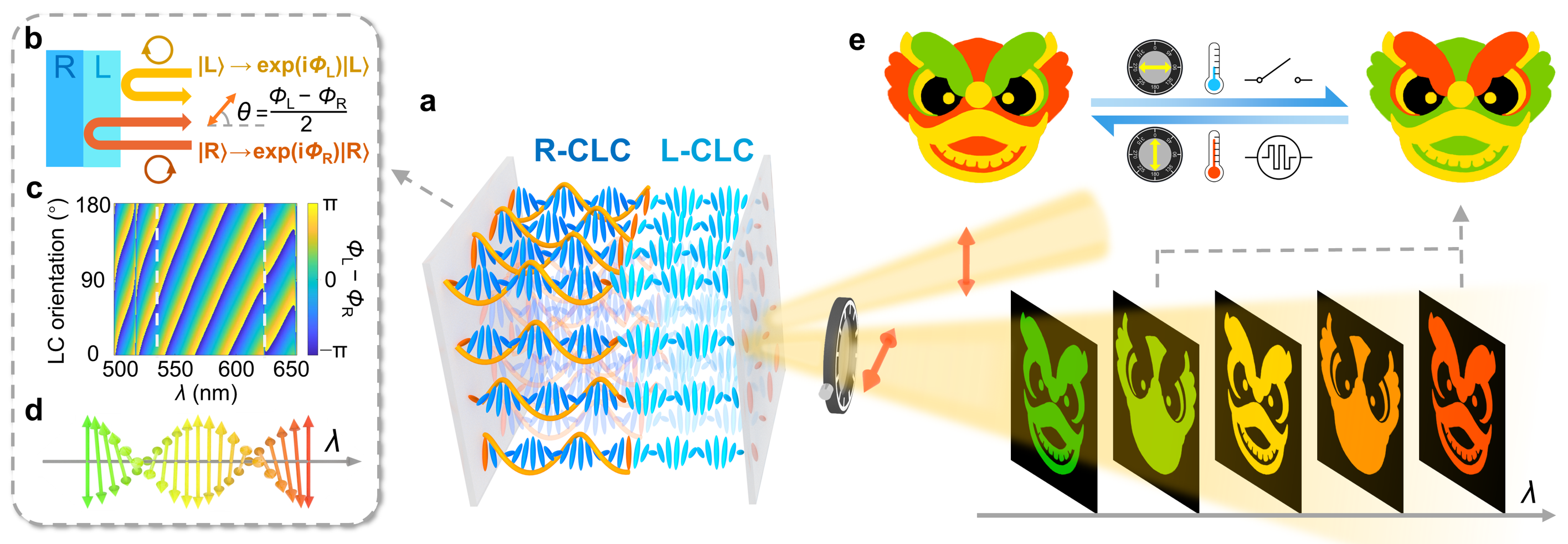 对电磁波的频率/波长、振幅、相位、偏振、横向分布等维度的按需调控,是当代信息光电子技术的物理基础。近年来,以高效率、高集成度、多维度、动态可调为核心目标,众多新颖光场调控手段不断涌现。其中,胆甾相液晶作为一种低成本、易加工的软物质光学材料,对温度、电场、磁场、光照、外力等刺激有着出色的灵敏响应性,为动态多维度、平面集成化的光场调控技术开辟了新道路。然而,目前的胆甾相液晶光学元件仍受限于较少的可操控维度或通道数,光学功能较为单一。针对这一难题,研究组受到手性介质旋光色散现象的启发,希望利用光偏振方向随波长旋转的特性,巧妙连接光的偏振和波长维度,并进一步探索旋光色散的动态可调性及其与额外光学维度(特别是空间相位)的有机结合,以期突破目前手性液晶光子元件的瓶颈。