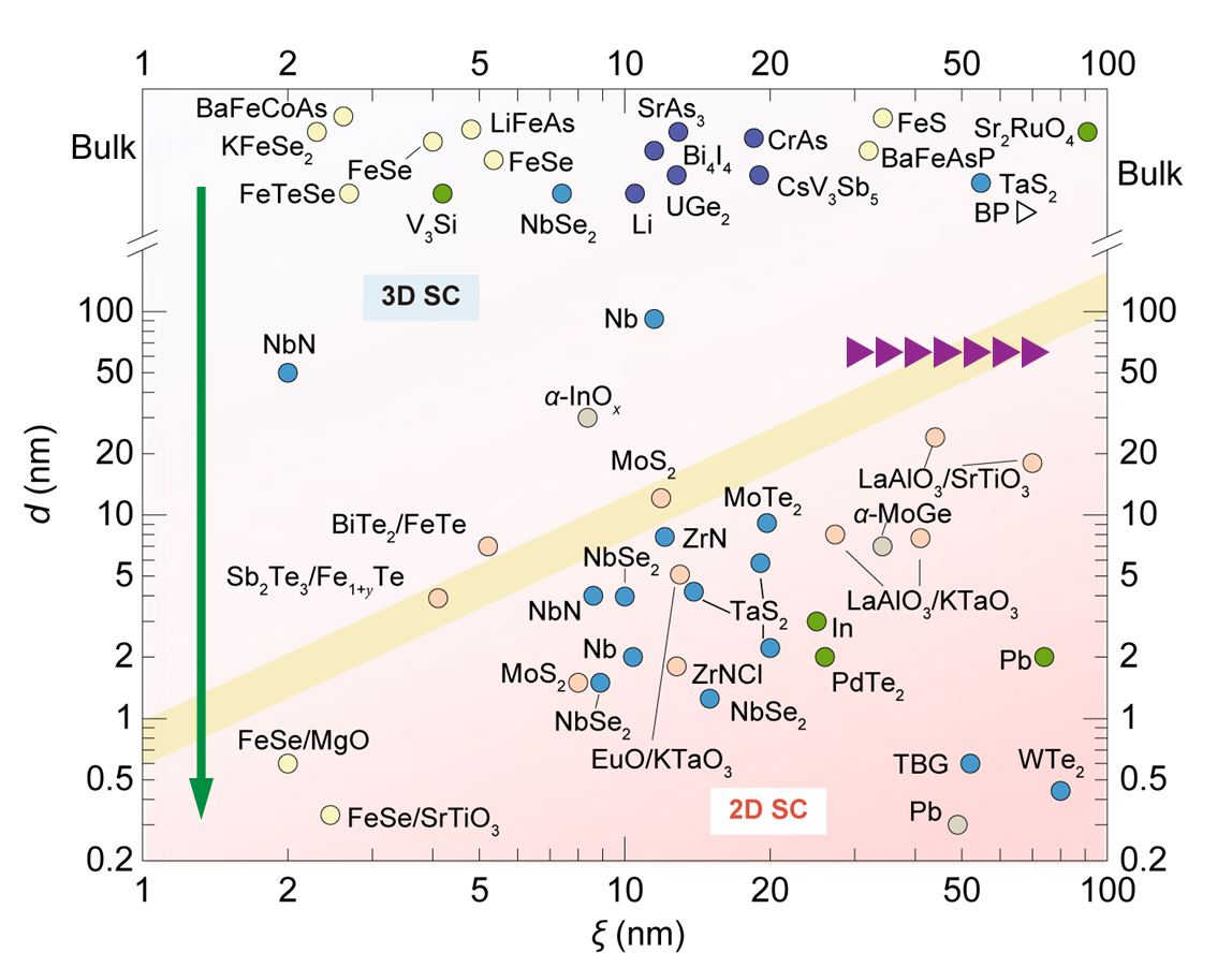 图1. 超导材料厚度与对应相干长度的相对关系。黄线是二维、三维超导体系的经验分界线。实现二维超导电性的传统途径是通过高端材料制备技术或者洁净解理技术,将有效超导厚度减薄到小于相干长度(纵向调控,绿色箭头所示);此研究工作提出了实现二维超导电性的全新途径:在样品厚度确定的情况下(例如50–70 nm),通过高压调控,使相干长度增加,直到大于超导体厚度,从而实现厚层样品中的二维超导电性(横向调控,紫色三角形所示)。