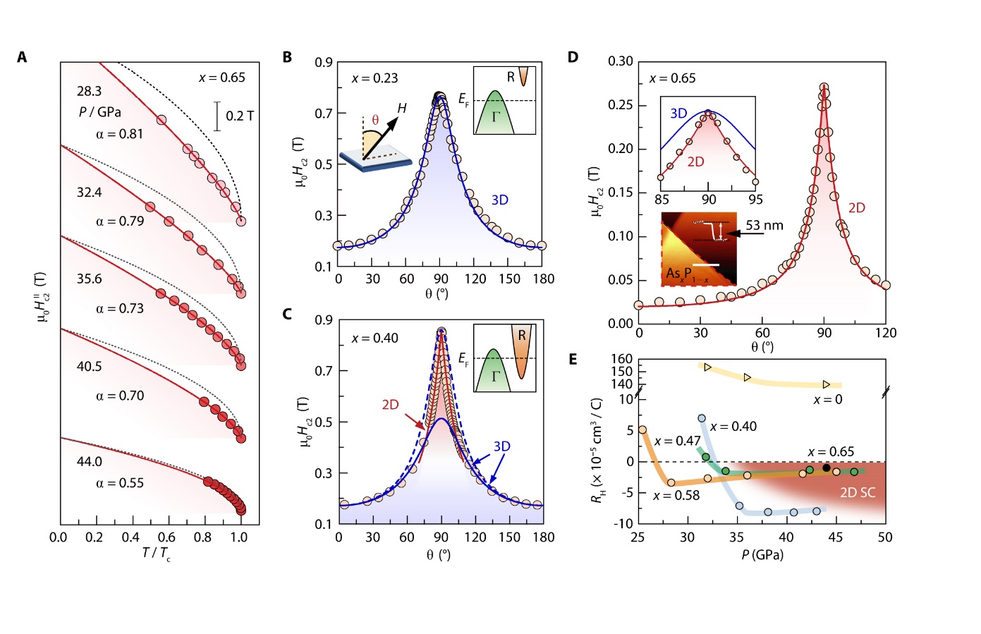 针对上述科学问题和技术挑战,在该研究工作中,作者们通过金刚石对顶砧高压技术在层状AsxP1−x实现了压致半导体-金属-超导体的转变。其中,压力诱导了材料的能带结构发生变化,产生了一个全新的小体积的费米口袋,使库珀对相干长度增加,从而在厚层AsxP1−x样品的超导相中发生了三维超导到二维超导电性的转变(图2B–D)。值得注意的是,高压二维超导态发生在具有结构各向同性的立方相中(Pmm)。在人们以往的认知中,这种各向同性的立方结构中的电子性质和超导电性应表现为三维特征。然而作者们却在各向同性的立方相中观察到了二维超导电性,并且其样品厚度(53 nm)也远大于传统二维超导体的厚度。这打破了人们此前对二维超导形成条件的刻板印象,加深了人们对超导体系中电子配对机制和其维度属性的理解。
