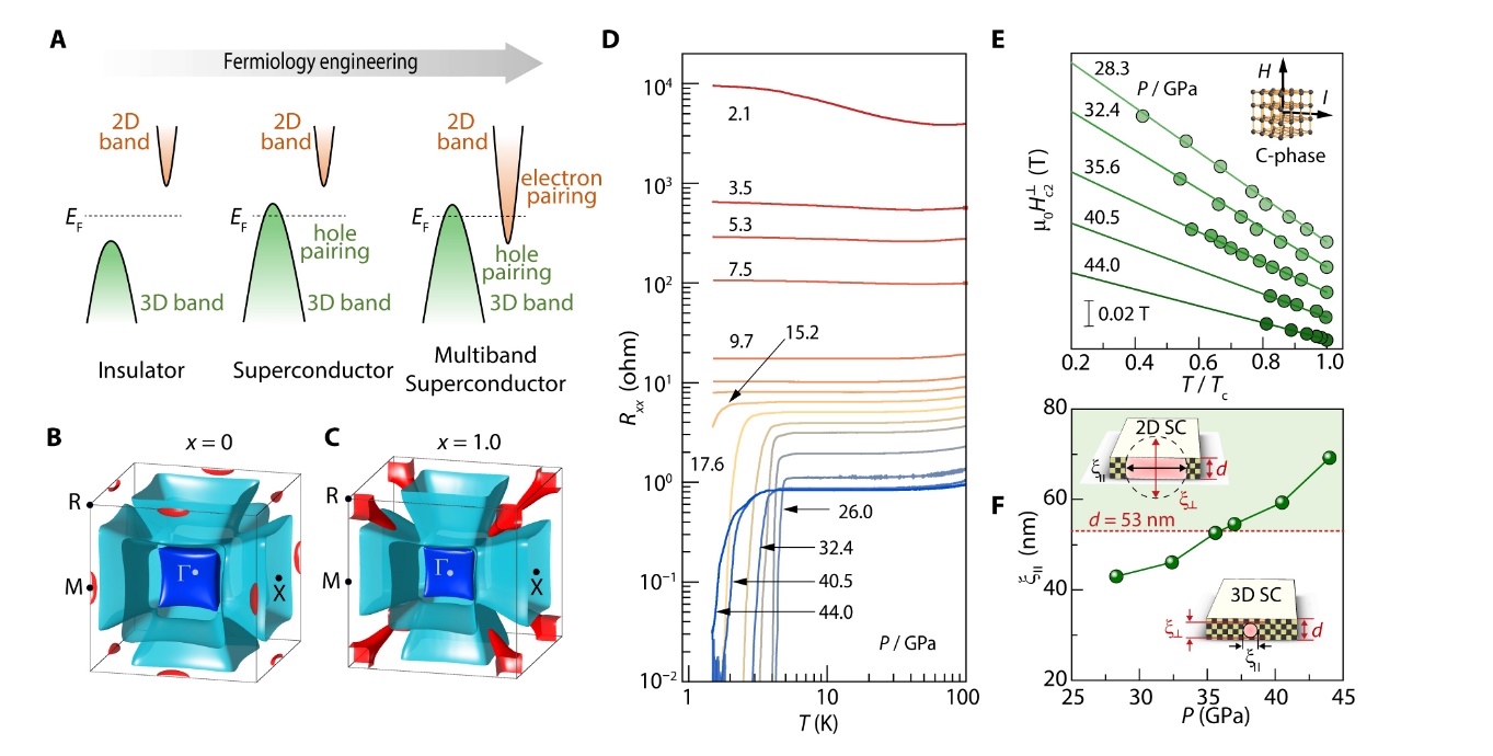 超导电性是凝聚态物理领域最重要的宏观量子现象之一。特别是二维极限下的超导体系,可以表现出丰富的奇异量子现象和额外的可调控自由度,是理解非常规超导机理的关键研究体系之一。例如,在二维超导体中可以存在量子金属态、Griffiths相变、Ising配对以及Berezinskii–Kosterlitz–Thouless相变等。由于超导库珀对的相干长度定义了其波函数的空间延展程度,所以人们一般通过比较超导库珀对的面外相干长度与超导体厚度之间的相对大小,来确定超导的维度属性。然而,绝大多数超导体的相干长度处于纳米量级,使得实现二维超导电性十分具有挑战性。目前,二维超导电性的实验研究非常依赖于先进的材料制备和调控技术(包括外延生长薄膜、机械剥离层状原子晶体或者界面栅极调控)。这些技术方法是在实空间内通过降低有效超导厚度,使其小于超导库珀对的面外相干长度,从而实现二维超导电性(图1)。有趣的是,在具有轨道选择配对的多带超导体中,具有不同的形状和色散关系的费米口袋可以对应着不同的超导相干长度,其超导电性的维度属性也可以不尽相同(图2A)。因此,在理论上,通过人为产生全新的具有二维色散的费米口袋,可以使超导体系中的相干长度显著增长,有助于实现厚样品中的二维超导电性。然而,如何从实验上,在超导材料能带结构中产生全新的费米面,或者对特定费米口袋进行精确调控,是极具挑战性的科学难题。