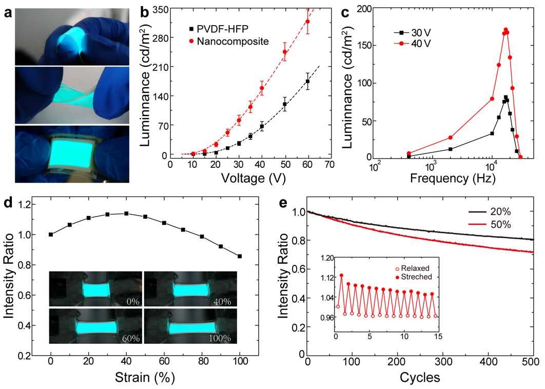 研究团队将制备的可拉伸高介电材料和ZnS:Cu粉体混合作为弹性发光层,同时改进浆料分散工艺,将发光层薄膜厚度控制在10微米左右,最终得到低压驱动的高亮度发光器件。发光器件在35V、17k Hz的驱动电压下发光亮度超过100cd/m2。所制备的器件可以在弯曲、扭转、拉伸至100%状态下依然保持正常发光。同时器件反复拉伸20%和50%500个循环后依然可以保持70%以上的初始亮度。