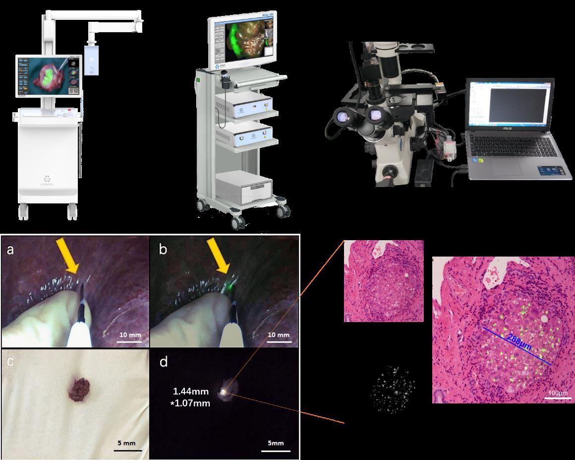 太阳成集团122ccvip现工院王毅庆课题组从2016年承担十三五国家重点研发计划(2016YFC0104100)的关键核心器件研发以来,又陆续承担了三项江苏省重点社发计划(前沿临床技术类BE2016731、BE2018618、BE2018698)和1项江苏省关键核心技术攻关项目。课题组与南京诺源医疗器械有限公司、南京鼓楼医院通过长期合作,形成产、学、研、医紧密结合的研发团队,已研发出了一个系列、三个分子荧光设备:适用于开放式手术的荧光手术导航设备FLI-10和适用于微创手术的荧光腔镜手术导航设备FLI-20以及术中实现病理和荧光双重快速诊断的显微设备(其中前两个设备已获得NMPA注册证并开始销售)。团队在南京鼓楼医院进行了30多例肝癌、10余例食道癌,通过上述系列设备,在术中发现了术前影像以及术中医生经验都无法发现的微小病灶,体内荧光显示达毫米级,术中快速荧光病理显微设备观察到了病灶内肿瘤组织与荧光的高度重合,其中最小的发现病灶是一枚早期肝癌,直径约288 μm,这是世界上首次报道用术中分子荧光技术发现并经病理确认的毫米级以下的肿瘤。这一发现代表着精准手术将从以往的厘米级跨越至毫米级以下的新高度,进一步提高肿瘤手术的切净率,减少复发及术后并发症,有望彻底解决手术中微小病灶定位和切缘残留查找的世界性医学难题。