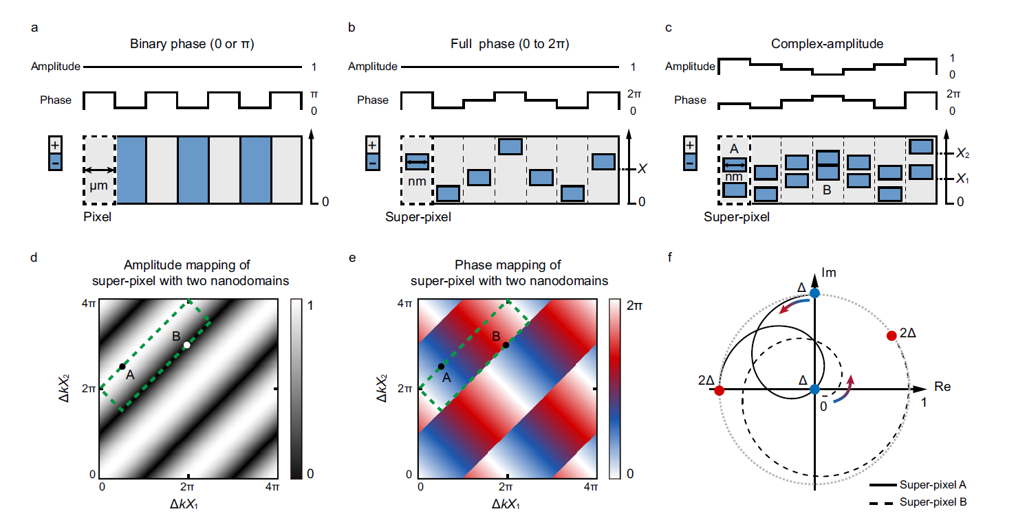 图1 纳米畴构建超像素结构示意图。a-b分别为二维非线性光子晶体中的二值化相位调控、超像素连续相位调控、超像素复振幅调控示意图。d-e分别为超像素调制振幅和相位与结构参数的映射关系。f为超像素调制复振幅在随相位失配变化在复平面的演化路线。