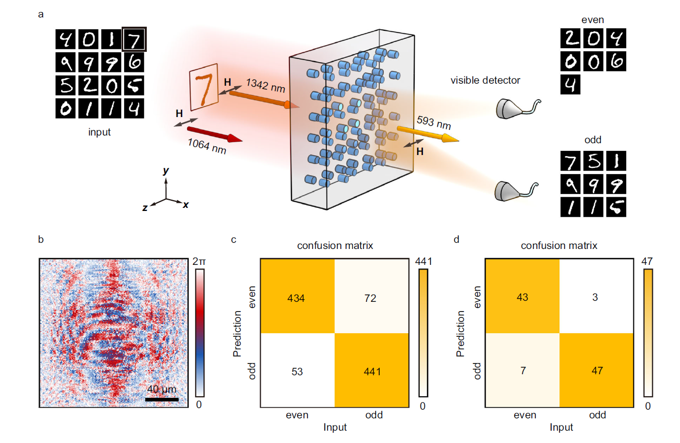 图4 基于频率上转换的手写数字分类。a上转换光学衍射神经网络对手写数字的奇偶分类示意图。b非线性全息图相位分布。c-d分别为数值和实验结果。