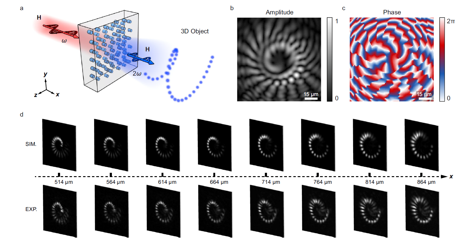 图2三维全息图像的非线性重构。a二次谐波复原三维图像示意图。b-c非线性全息图振幅和相位分布。d二次谐波图案沿传播方向分布的模拟和实验结果。