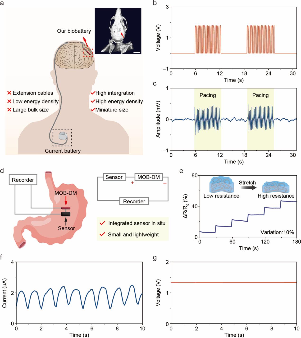 研究人员发现得益于镁氧气电池的高能量密度和生物安全的优势,镁氧气生物电池可以与医疗器件进行高度集成,实现微型化。例如,镁氧气电池可以与脑部刺激器高度集成,具有足够小的体积,置于颅内进行原位电刺激,排除导线引起的感染和由导线断裂引起的设备故障风险。此外,由于体积小且重量轻,镁氧气生物电池与聚丙烯酰胺水凝胶应变传感器集成后可以直接黏附在胃表面,以监测胃蠕动。