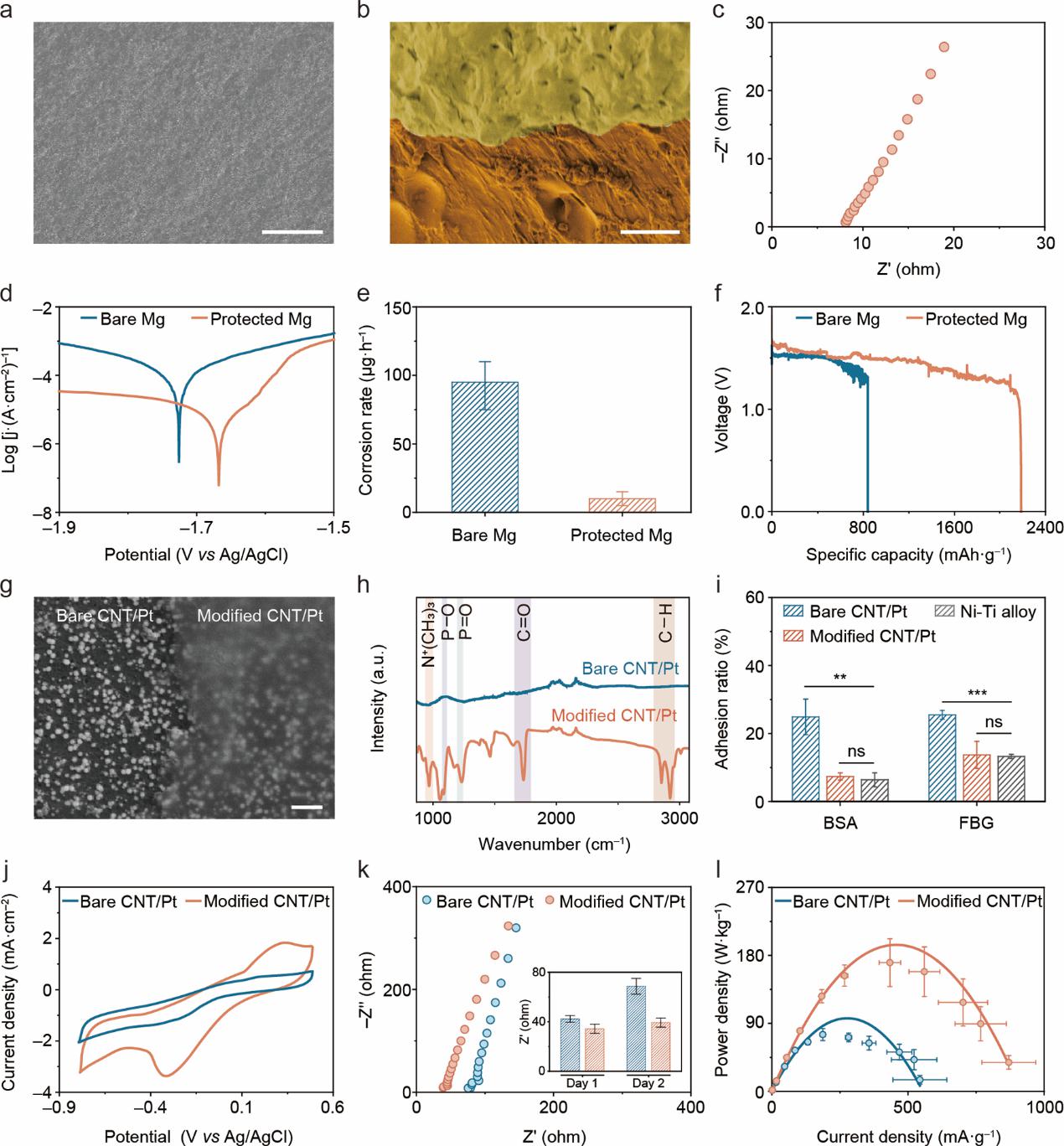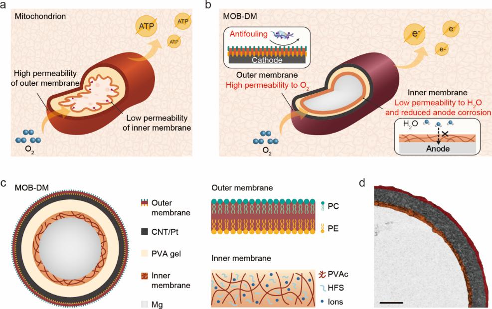 线粒体具有独特的双层膜结构,能够高效利用体液中氧气源源不断地产生能量。其中内膜具有较低的渗透性,将能量转化区域与细胞内环境隔离;而外膜具有较高的渗透性,确保氧气等物质的传递,并且与细胞内环境具有良好的生物相容性。这一特性为我们设计具有优异环境适应能力的高性能电池提供了启示。本工作通过模仿线粒体结构,设计了一种具有双层膜结构的高性能镁氧气电池,结构如图1所示,内膜通过原位包覆的方法制备疏水聚合物网络聚醋酸乙烯酯,实现离子传输的同时,限制水的渗透,进而减少镁负极的腐蚀和钝化,提高镁负极利用率,实现高能量密度。外膜通过接枝聚合的方法,构建两性离子磷脂分子层,获得高的氧气渗透性,确保正极持续稳定反应,同时限制离子扩散,实现良好的生物安全性(图2)。