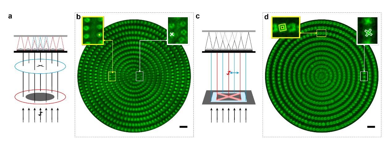 针对这一课题,研究团队在前期近晶相液晶多层级超结构多维操控研究(Adv. Mater. 2017, 29, 1606671)的基础上,提出了一种利用自组装非对称结构液晶微透镜阵列进行成像探测的方案。基于液晶光配向技术的图案化诱导,实现焦锥畴自组装过程中液晶层曲率的灵活控制,进而构筑结构畸变可控的微透镜单元,获得对称性破缺的相位分布。依赖结构畸变方向的可控性,可利用其对入射线偏振的选择成像特征进行偏振探测。通过预设取向单元的尺寸则可以精确操控液晶微透镜的焦距。我们设计制备了一个尺寸随径向变化,朝向随角向变化的透镜阵列,通过其进行单次拍摄即可依据成像清晰度坐标中最清晰点的位置,提取出待测物的高度相信息和偏振信息,结合微透镜自身的二维成像能力,即实现了对目标物体四维信息的可视化探测。与此同时,液晶微透镜阵列的偏振选择性与多焦能力,还赋予了其多路复用/解复用偏振信息与深度信息的功能,在光通信领域也具有应用潜力。