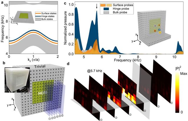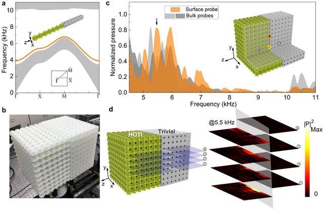 此前,人们普遍认为拓扑材料都遵循严格的体-边对应关系:即拓扑表面态只出现在比材料本身低一个维度的边界上。因此,如果要同时实现二维表面态、一维边界态和零维局域态,则需要设计多种不同几何结构的拓扑材料, 这大大增加了波调控和器件设计的复杂性,进而限制了器件的集成化和微型化。如何能够在同一个材料中实现拓扑保护的二维界面、一维波导以及零维腔?这个问题的解决不仅在拓扑物理上有重要的理论意义,而且对拓扑材料和器件的应用有重要的价值。针对这一问题,本文设计和实现一类三维高阶拓扑材料,它同时存在具有拓扑鲁棒性的二维界面态、一维棱态以及零维角态。这一现象的理论基础是一种新的高阶多维度的体-边对应关系:即层级体-界面-棱-角对应关系。文章发现,系统中不同维度的拓扑态可以在频域上分离,这意味着人们可以在不同的频率上,对不同维度的声/光波进行独立调控。这一成果是高阶拓扑态研究的一项重要进展,具有重要的理论价值和应用前景。
