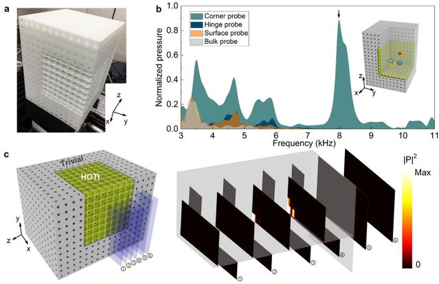 图4. 零维角态的实验表征。a. 3D打印样品,用以测量拓扑界面态、棱态以及角态。b. 实验测量的透射谱:其中界面态对应橘黄色线/阴影、棱态对应深蓝色线/阴影、角态对应深绿色线/阴影。可以看出角态的响应发生在体态、界面态以及棱态的带隙中。此外,界面态与棱态的响应在不同的频率范围有不同的响应强度,说明这些拓扑态可以用不同频率独立激发,体现了其多维层级的特征。c.角态的声场实验扫描切面图。可以看到,激发的声场主要局域在角上,远离角声场快速衰减。这些特征与角态相符合。