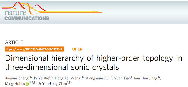 公司卢明辉、陈延峰的研究团队,与苏州大学蒋建华的研究团队合作,在拓扑物理和材料研究方面取得重要进展。他们发现二维拓扑界面态、一维拓扑棱态以及零维拓扑角态可以存在于同一个声学结构中,并基于精确设计和3D打印技术实现了这种支持多维层级拓扑态的三维高阶声拓扑绝缘体。文章以“Dimensional hierarchy of higher-order topology in three-dimensional sonic crystals”为题发表于近期的Nature Communications。