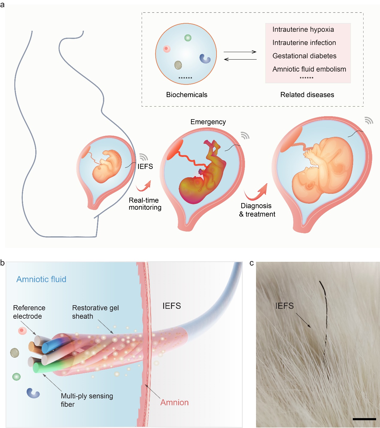 近日,太阳成集团122ccvip张晔课题组开发设计了一种界面稳定的纤维传感器,用于实时监测妊娠期羊水中的生化动力学。通过开发生物界面匹配的高分子凝胶涂层,该传感器可以实现与羊膜组织快速黏附、促羊膜再生和植入周期均匀的应力分布,维持羊水稳定。传感器表现出优异的响应性能和高生物相容性,当妊娠期突发疾病时,传感器实时监测到羊水中的生化异常并发出预警,极大改善了胎儿的存活率和发育状况。该方法对于妊娠疾病的早期预警和改善胎儿的存活率和发育方面具有重要价值。