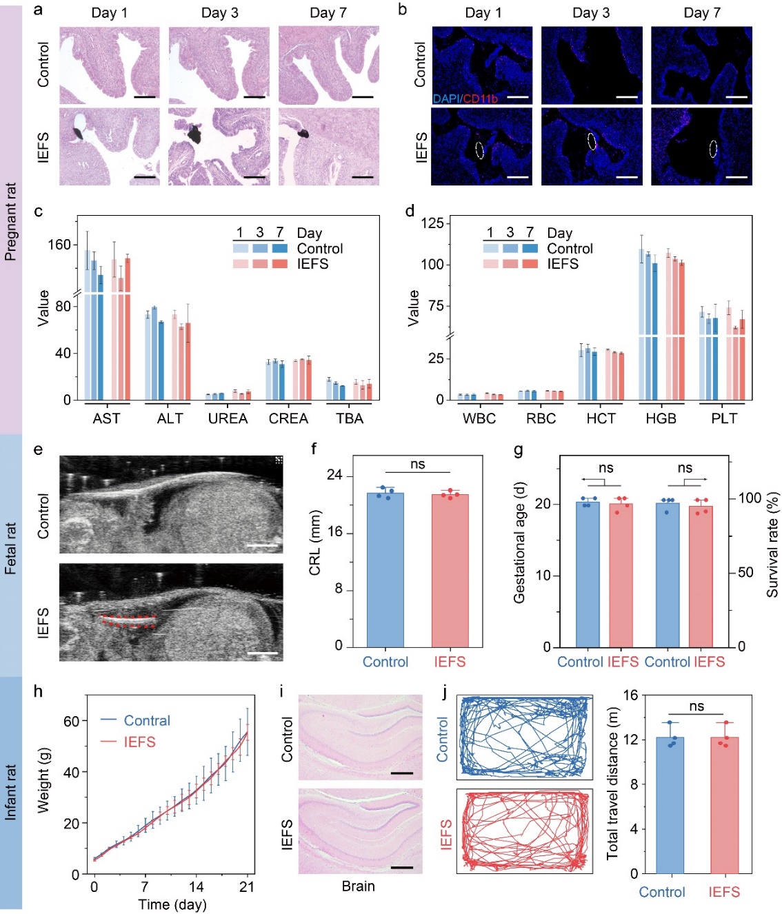由于传感器与羊膜的稳定界面,其在体内的生物相容性得到了保证。将传感器植入后,未观察到明显的炎性细胞浸润。血细胞和血生化指标以及核心器官的状况与空白对照组一致。进一步评估其对胎儿的影响,通过B超验证了胎儿的大脑和四肢发育,并未观察到明显差异,妊娠大鼠的孕龄和子代存活率也与对照组一致。子鼠的体重,大脑发育和认知行为与正常鼠无统计学差异,证明了纤维传感器良好的生物安全性(图3)。