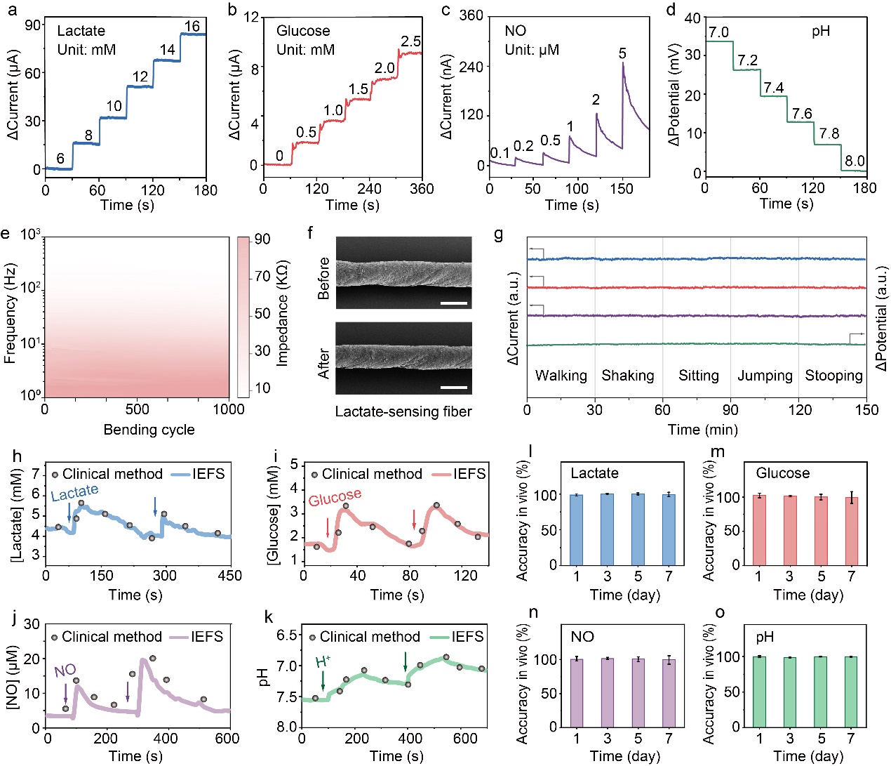 研究人员进一步评估了纤维传感器的响应性能(图4)。其表现出优异的灵敏度和响应范围,满足评估羊水中相应生化物质的动态波动。在磷酸盐缓冲液中浸泡30天,其信号强度保持稳定。传感器实时检测的生化信号与临床金标准(体外断点测量)相比,准确度高达98%。此外,在模拟行走、摇晃、跳跃和弯腰等人体活动中,响应信号没有明显扰动。
