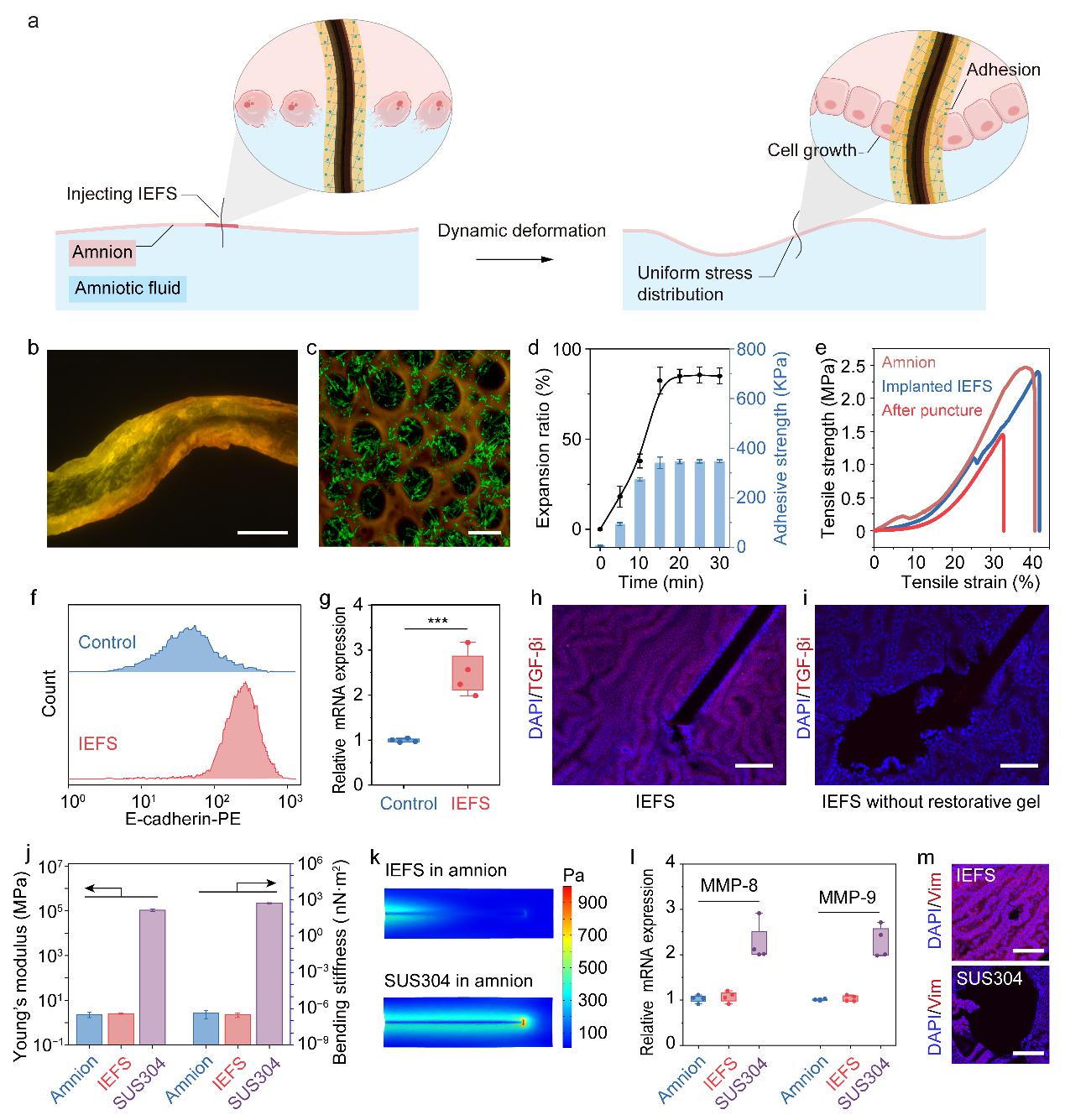 纤维传感器植入后,高分子凝胶在15分钟内膨胀并封闭伤口,然后紧密贴合在羊膜上。随后通过释放凝胶中的Ⅰ型胶原蛋白促进羊膜上皮细胞向修复性羊膜间质细胞转化。羊膜间质细胞通过分泌转化生长因子-β诱导蛋白ig-h3(TGF-βi),来重塑羊膜周围的环境,促进伤口愈合。作为羊膜完整性的有力证据,传感器植入后,促炎细胞因子白细胞介素-6(IL-6)、IL-1β以及羊水的菌落培养和空白对照组无统计学差异。在整个植入期间,传感器与羊膜的力学性能相匹配,作为局部应力的指标,基质金属蛋白酶-8(MMP-8)和MMP-9的表达和空白对照组一致,且羊膜没有产生额外的破裂(图2)。