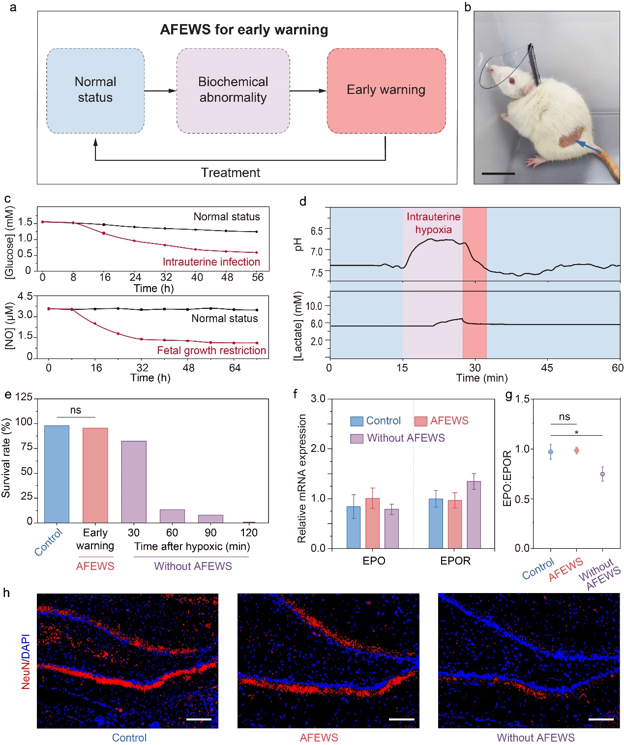通过将纤维传感器与柔性芯片集成,实现了对妊娠疾病的早期检测预警(图5)。具体而言,纤维传感器将检测到的生化信号转换为电信号,然后由柔性芯片收集并处理,通过蓝牙无线传输至手机,从而实现对生化物质的持续实时监测。将其应用在大鼠宫内缺氧的疾病模型中,当发生急性缺氧时,羊水pH迅速从7.4下降到6.7,而乳酸浓度在10分钟内从5.2增加到7.2 mM。当监测到乳酸浓度超过7.2 mM后,传感器发出早期警告,并及时采取相关治疗措施。得益于传感器的检测预警,胎鼠的存活率达到了95%,接近未受影响的胎鼠水平。相比之下,没有传感器的检测预警,在缺氧1小时后,存活率仅为13.3%,并且幼鼠脑部的促红细胞生成素明显降低,大脑发育大幅受损。因此,纤维传感器在妊娠疾病的早期预警和改善胎儿的存活率和发育方面具有重要价值。