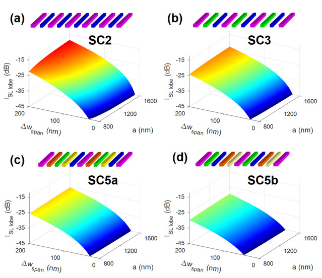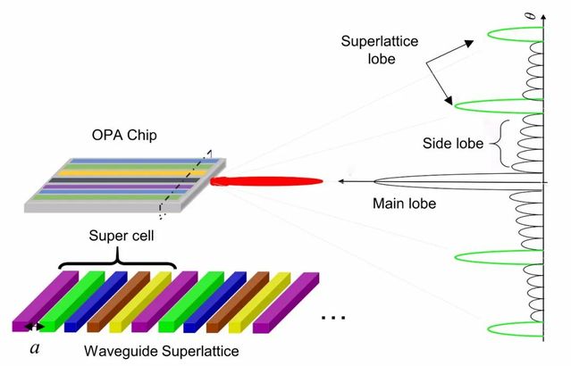 此工作发展了基于波导超晶格的光学相控阵的基本理论,阐明了波导超晶格的非均匀性带来的主要影响表现为由超晶格结构诱导出的一类次光束(可称为“超晶格瓣”);并给出了抑制此类次光束的方案。为保证光学相控阵的工作,需要抑制不同波导间的模式耦合(即信号串扰)。波导超晶格将不同宽度的波导组成超元胞,从而使不同波导中模式的传播常数产生差异,以此抑制波导间的模式耦合。此前该组的研究已经给出抑制串扰的理论。此次工作中的基于波导超晶格的光学相控阵理论表明:为抑制“超晶格瓣”这种次光束,原则上波导超晶格的非均匀性应当尽可能小。而抑制串扰要求不同波导的模式传播常数有较大差异,即波导超晶格的非均匀性应当足够大。两种需求之间产生了矛盾。针对此问题,该课题组发现超元胞内光的横向相干性可用来调控光束特性;且当超元胞较大时,可提供足够多的光调控自由度来抑制“超晶格瓣”,进而发现了均衡抑制次光束与波导间串扰的理论依据。最终找到了一种波导超晶格结构(SC5b)可使相应的光学相控阵性能比较接近理想的半波长阵元间距的均匀光学相控阵的性能。
