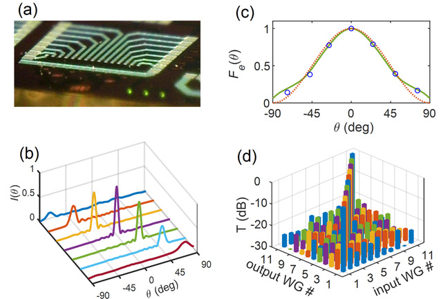 图3. 实验结果。(a) 芯片光学显微图;(b) 不同角度的光束;(c) 光束峰值(空心圆点)与理论包络曲线(绿实线); (d) 波导间串扰皆低于-20dB。
