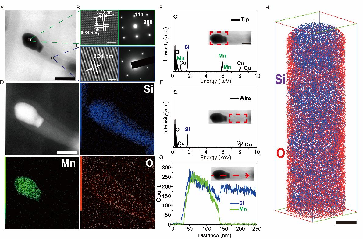 图二 锰催化剂制备的硅纳米线的TEM及三位原子探针的表征结果,无任何锰杂质信号被检测出。