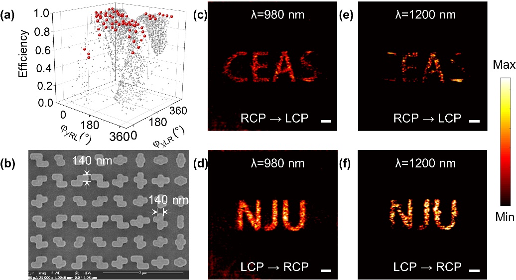 图3 手性超构原子实现自旋解耦的全息成像 (a)参数空间图(b)样品电镜图(c)-(f)设计波长及宽带内不同圆偏振光入射得到的全息图。