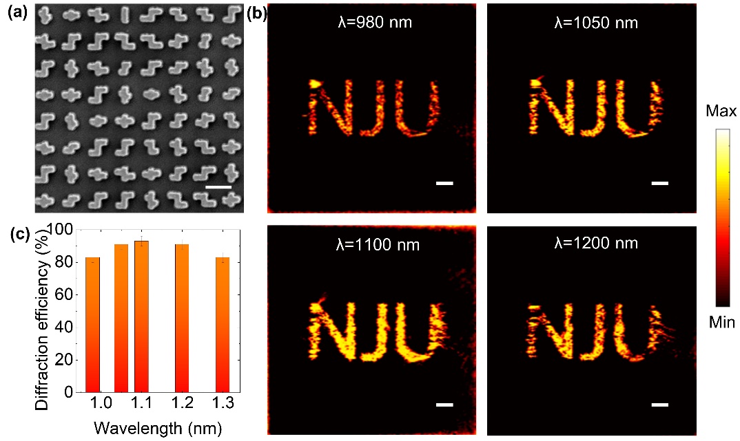 图2 手性超构原子在单一圆偏振光下的波前调控结果(a)样品电镜照片(b)实验得到的全息图(c)宽带内的衍射效率分布。