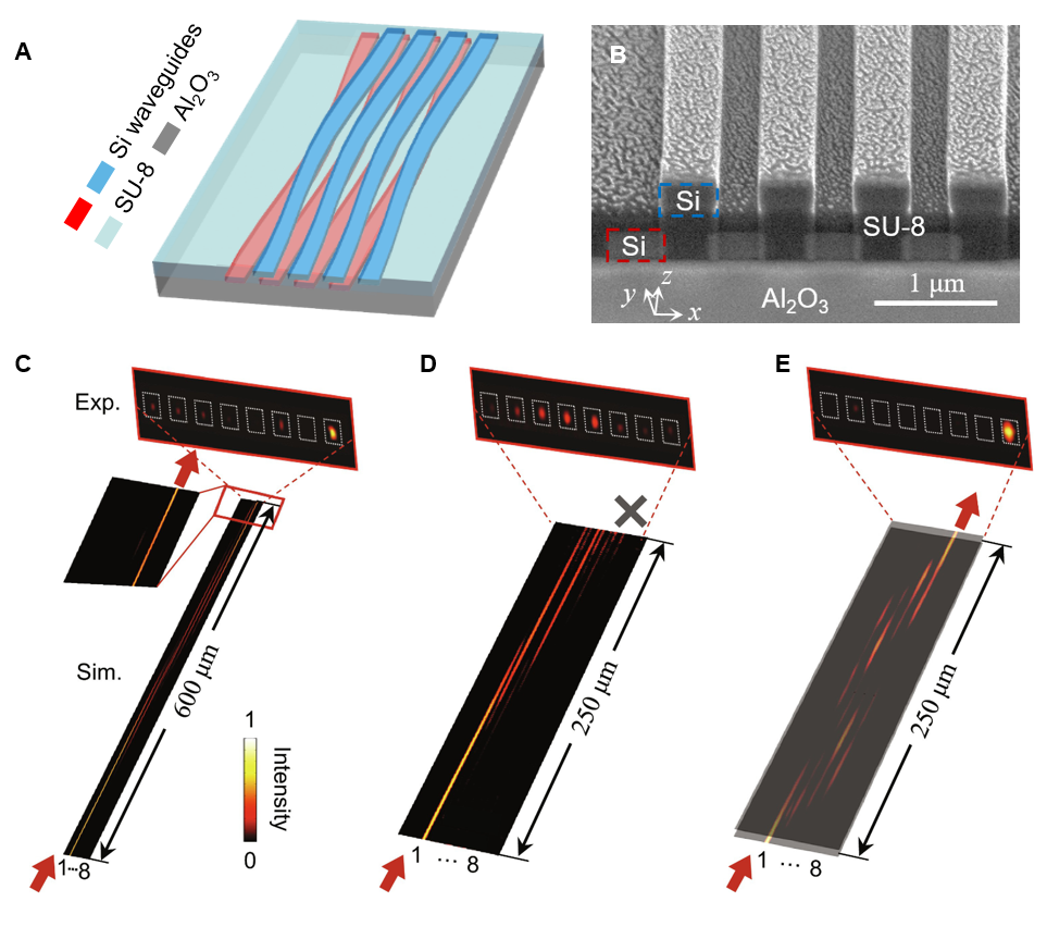 图2. 双层硅波导阵列的模型示意图(A)与实验样品的电镜图(B)。(C)传统泵浦过程需要在较长的体系中才能实现。(D)缩短体系会导致绝热条件的破坏与泵浦的失效。(E)在同一长度下,次近邻耦合的引入会恢复拓扑泵浦。