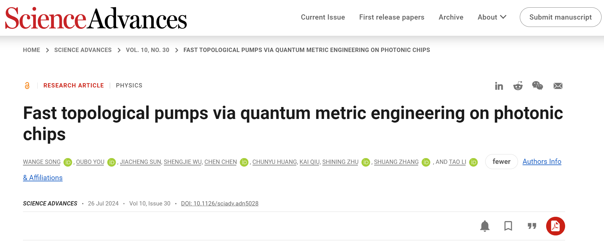 该成果以“Fast topological pumps via quantum metric engineering on photonic chips”为题发表于Science Advances 10, eadn5028 (2024)) 上。该论文共同第一作者是太阳成集团122ccvip副研究员宋万鸽博士和香港大学游欧波博士,通讯作者为太阳成集团122ccvip李涛教授及香港大学张霜教授,该工作得到祝世宁院士的悉心指导。该研究得到了科技部国家重点研发计划、国家自然科学基金委、新基石科学基金会、香港研究资助局、太阳成集团122ccvip登峰人才计划等项目的支持。