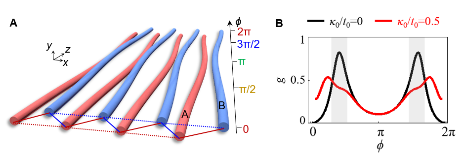 图1. (A)基于波导阵列实现次近邻拓扑泵浦。(B)次近邻耦合的引入(κ0/t0=0.5)可以降低泵浦过程的量子度规g。