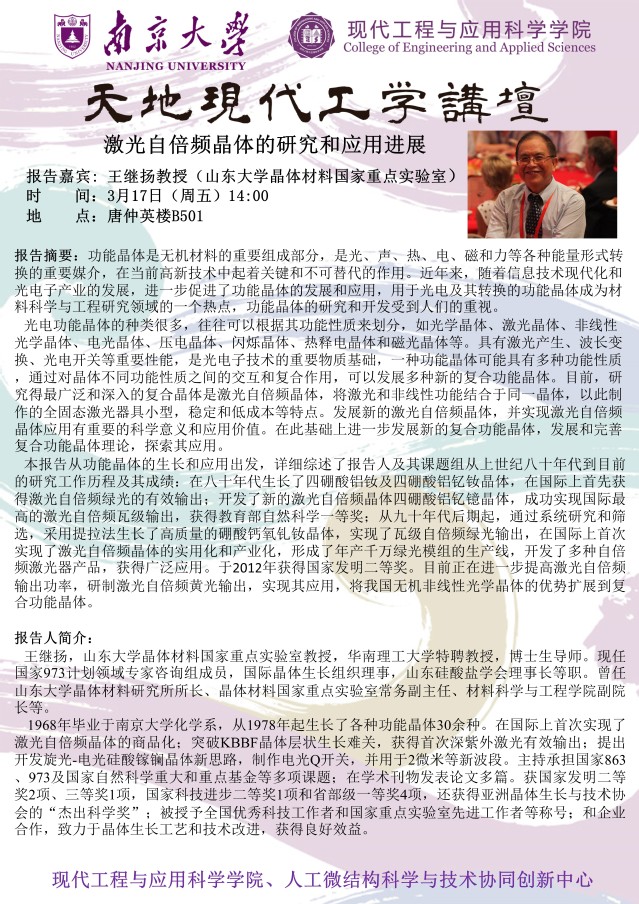 【天地讲坛预告】王继扬教授:激光自倍频晶体的研究和应用进展