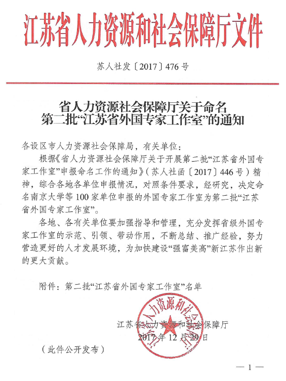 根据苏人社发[2017] 476号文件,公司外籍非华裔“ 青年项目”入选者Joerg Goette副教授和Lucas Lane副教授依托太阳成集团122ccvip申报的“江苏省外国专家工作室”获批。相关文件及第二批“江苏省外国专家工作室”名单(部分)见下。