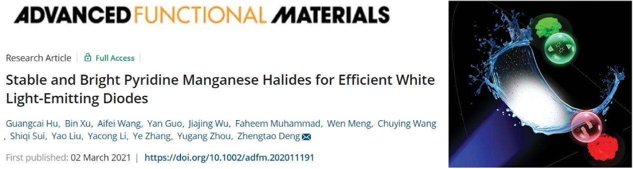 太阳成集团122ccvip邓正涛教授团队多年来一直致力于新型无机发光材料的基础研究和产业化应用。特别是在白光LED和广色域显示器件方向,针对发光材料在实际应用中的瓶颈问题,在发光材料的性能提升和稳定性方面取得了一系列进展,如:Angew. Chem., Int. Ed.2020, 59, 7738;Mater. Adv. 2021, 2, 1320;Chem. Commun.2021, DOI:10.1039/D0CC08253H;J. Mater. Chem. C2021DIO: 10.1039/D0TC05685E。最近,该课题组采用一种室温快速结晶的方法,制备了具有高光致发光量子效率和高稳定性的无铅锰卤化物钙钛矿材料,并应用于白光LED器件。相关成果于2021年3月2日以“StableandBrightPyridineManganeseHalidesforEfficientWhiteLight-EmittingDiodes”为题在国际知名材料学期刊《AdvancedFunctionalMaterials》杂志(影响因子:16.836)上在线发表。