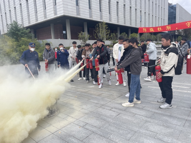 讲座最后,同学们来到了室外,在消防员的讲解和指导下实地操作干粉灭火器和二氧化碳灭火器,并试戴了消防面具。部分同学第一次接触这些消防安全器材,现场实操也让同学们更加熟悉消防器材的使用方法。