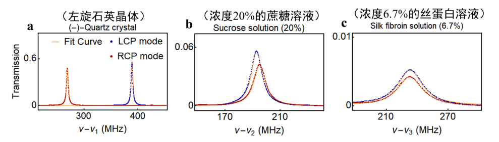 图3. 三种不同的手性材料的透射光谱: (a)左旋石英晶体,(b)浓度20%的蔗糖溶液, (c)浓度6.7%的丝蛋白溶液。
