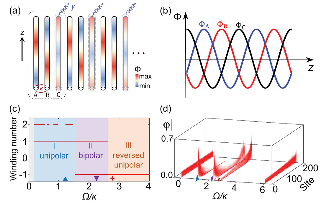 在本工作中,研究人员考虑了有效折射率实部沿传播方向变化的波导阵列,如图1(a,b)所示,其中一个原胞中有三根波导(A, B, C),C波导中存在损耗。这种有效折射率调制在规范变换后可以等效为一种规范场,为波导之间的耦合提供了等效的相位因子。通过Floquet理论求解该体系并计算其复空间能谱的卷绕数,可以发现其随着调制频率的变化,体系中存在三种非厄米拓扑相,分别为I. 单极(unipolar),II. 双极 (bipolar) 和III. 反向单极相(reversed unipolar),如图1(c)所示。这些相中对应的开链 (OBC) 的本征态分布如图1(d)所示,可以看到随着调制频率的增大,体系的本征态从堆积在左边界,到堆积两个边界,再堆积到右边界上,这非常直观地展示了不同的非厄米相的本征属性。
